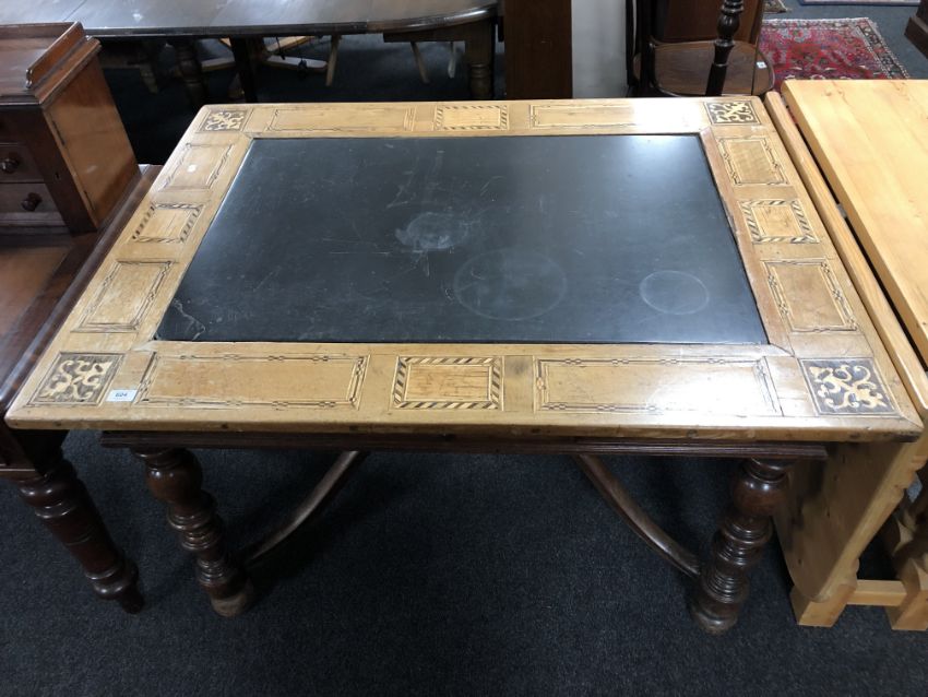 A 19th century oak and beech marquetry inlaid library table with a marble inset panel, width 123 cm