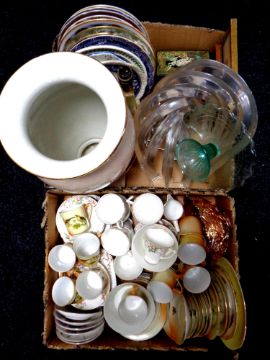 Two boxes containing assorted ceramics to include English and Czechoslovakian tea china, carnival glass bowl, plates, contemporary light fitting, onyx table lamp etc