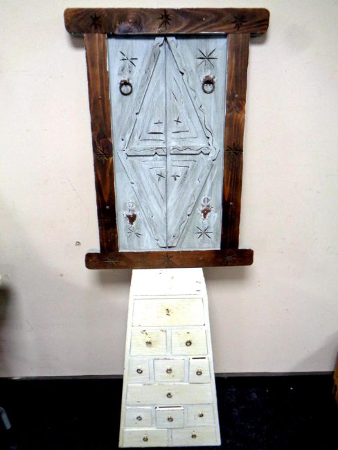 A painted wooden multi drawer chest together with a painted wooden shutter