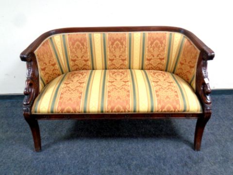 A reproduction Egyptian revival settee in a classical striped fabric, width 136 cm