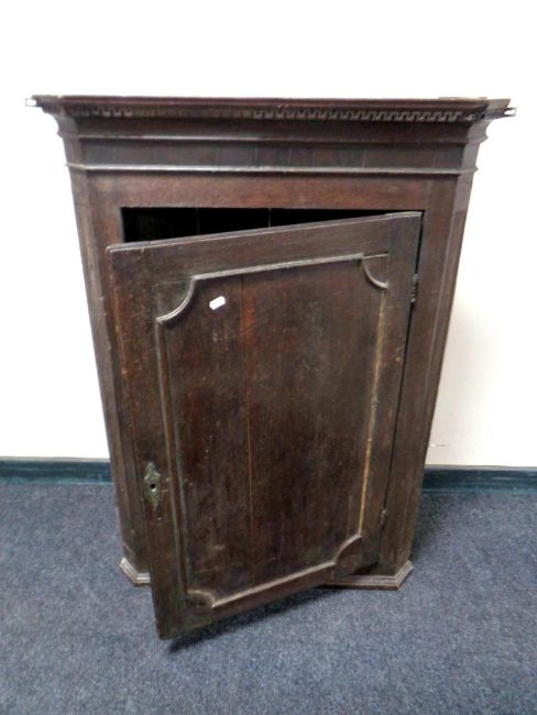 A late 18th/early 19th century oak panel door hanging corner cabinet