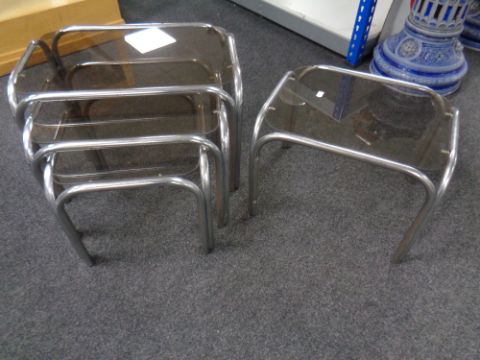 A nest of three 20th century tubular metal glass topped tables and a further matching table