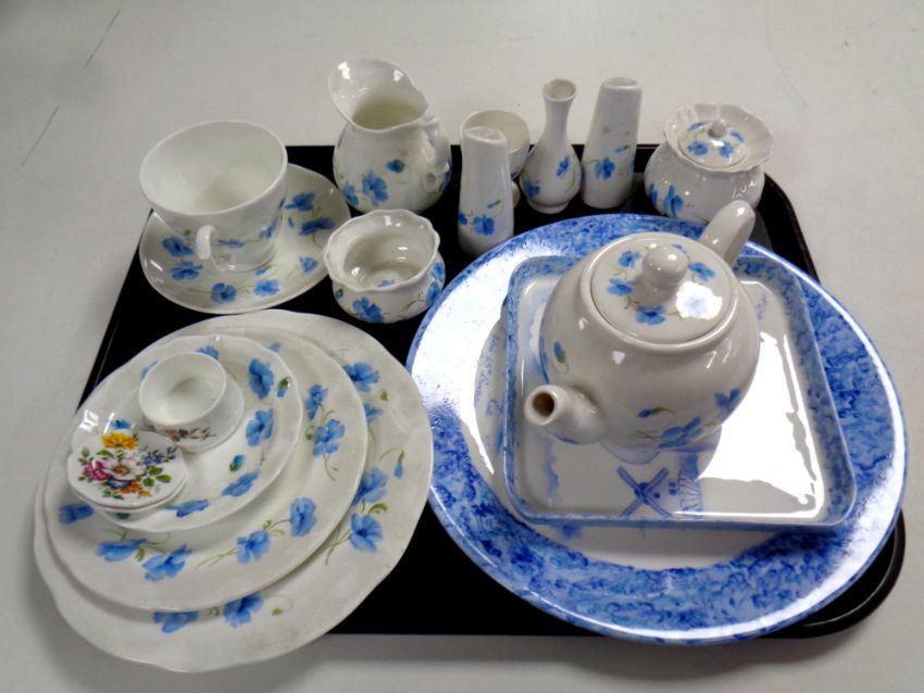 A tray containing fifteen pieces of hand painted china together with a Wedgwood pot and two miniature china pin dishes