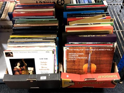 Two boxes containing vinyl LP box sets including Reader's Digest, Glen Miller, Hit Parade, classical to include Beethoven, Tchaikovsky, Mozart etc