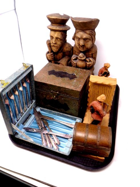 A tray containing two pairs of bookends, cased set of fish cutlery, brass trinket box