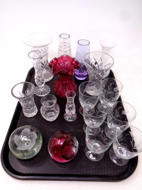 A tray containing assorted glassware to include glass paperweights, cranberry glass vase
