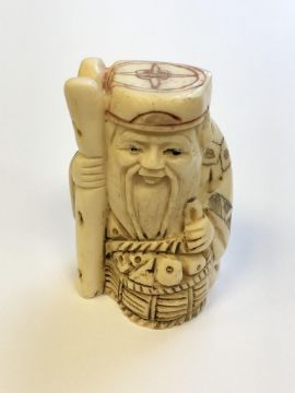 A Japanese carved bone netsuke - village elder with basket at his feet
