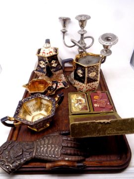 An Edwardian oak twin handled serving tray together with a five piece antique lustre pottery tea set, three way plated table candelabra, cards in a leather case