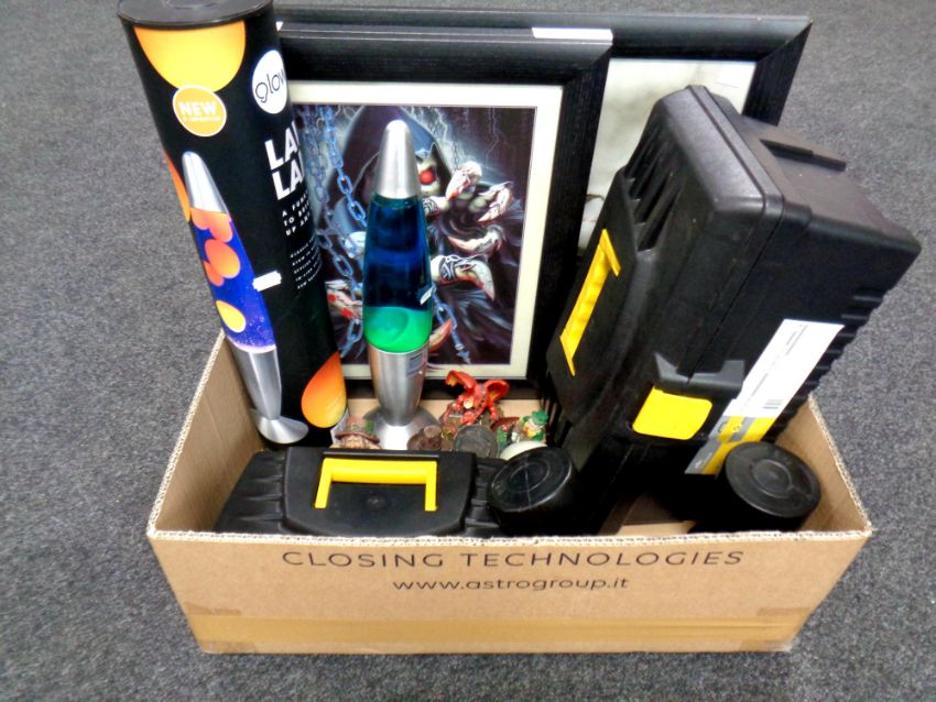 A box containing plastic toolboxes, framed pictures, ornaments, two lava lamps