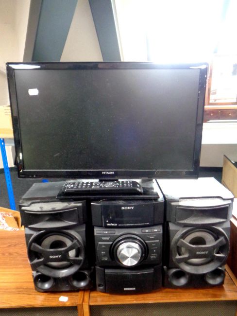 A Sony mini hifi component system together with a Hitachi 22'' LCD TV DVD with universal remote