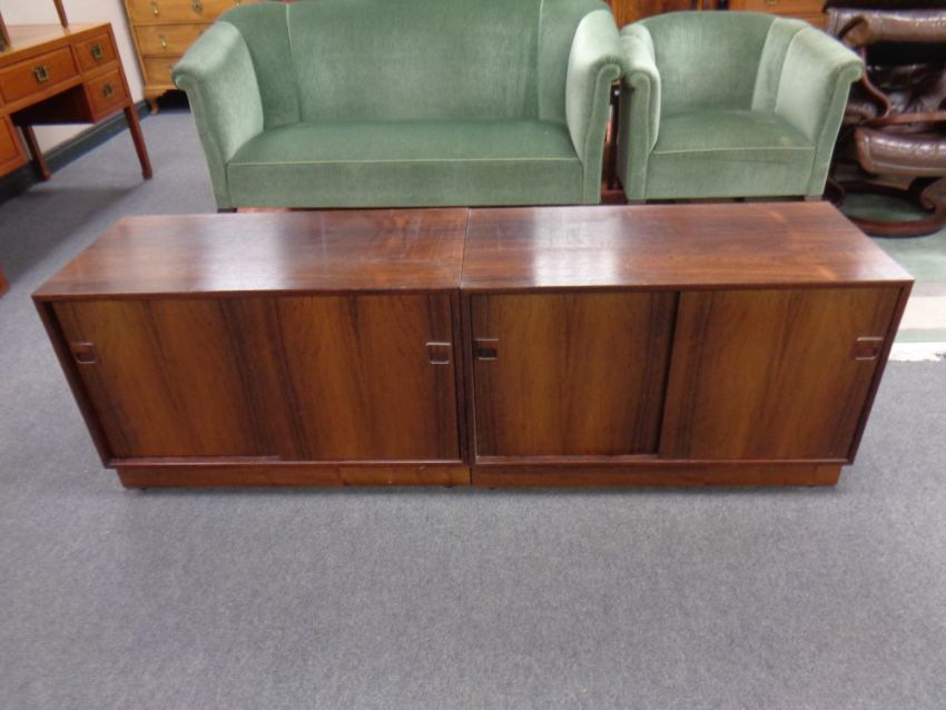 A pair of 20th century Danish Hjernebo double door low cabinets, individual width 85.5 cm
