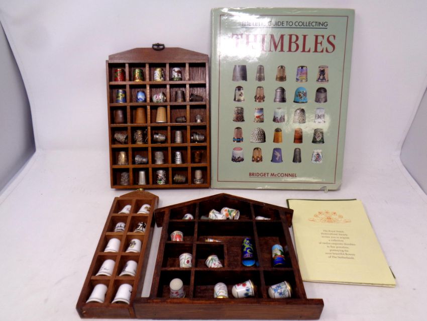A large wooden thimble stand together with three further thimble stands containing a large quantity of enamel bone china and metal thimbles, together with a thimbles collector's guide