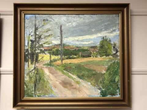 Continental school : A country track with buildings beyond, oil on canvas, 62 x 54 cm