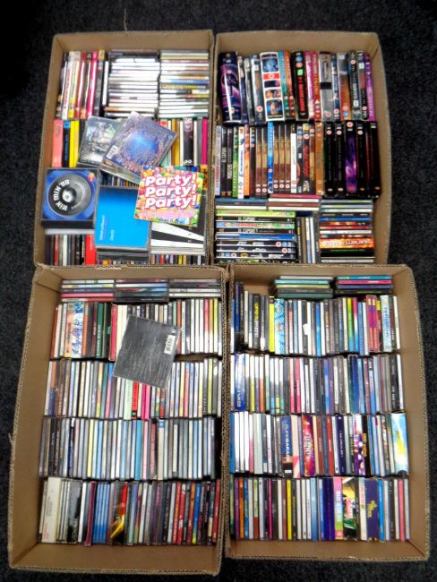 Four boxes containing a large quantity of assorted CDs and DVDs to include Club Land, Now compilations etc