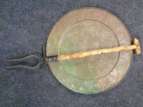 A rustic hayfork together with a circular Egyptian design copper plaque
