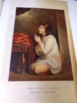 A 19th century leather and brass bound holy bible with colour book plates together with a further 19th century music book