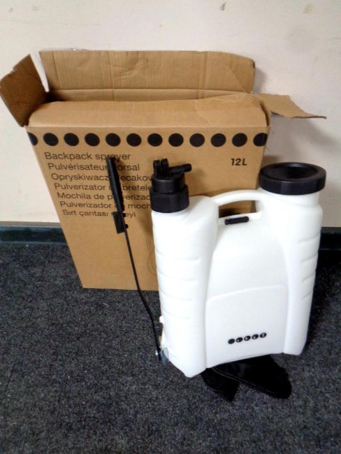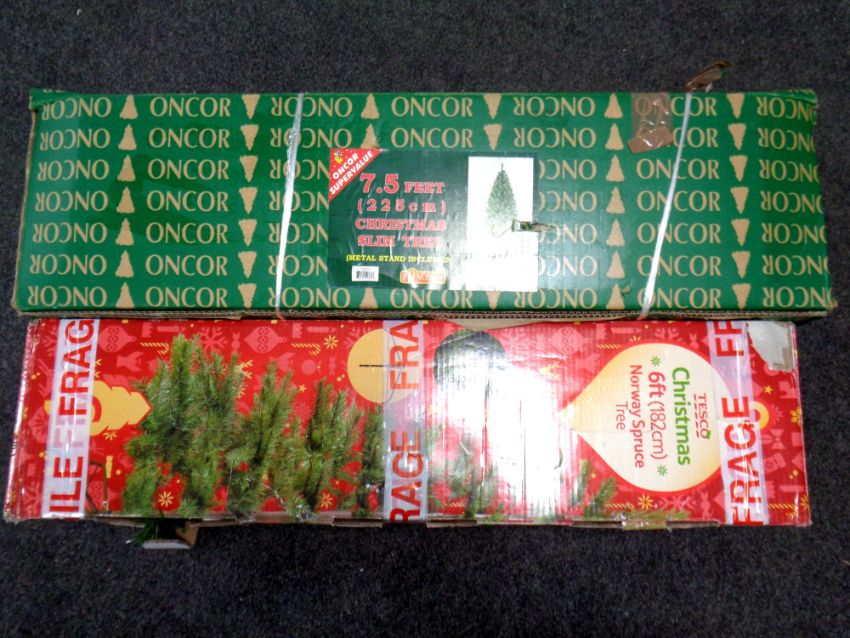 A garden backpack sprayer together with two Christmas trees, all parts boxed