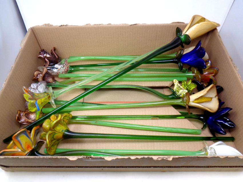 A box containing seventeen glass long stemmed flowers