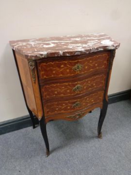 A French inlaid marble topped serpentine fronted three drawer chest on raised legs with brass mounts