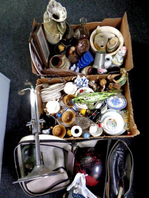 Two boxes containing a large quantity of miscellaneous glassware and ceramics to include Venetian fish ornament, tea ware, plated wares, antique pewter tankards, together with a bowling ball in bag and a bar optic stand