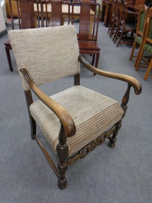 A carved beechwood armchair upholstered in a beige fabric