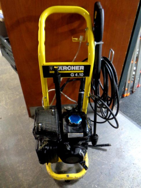 A Karcher G4.10 petrol pressure washer with hose and nozzles