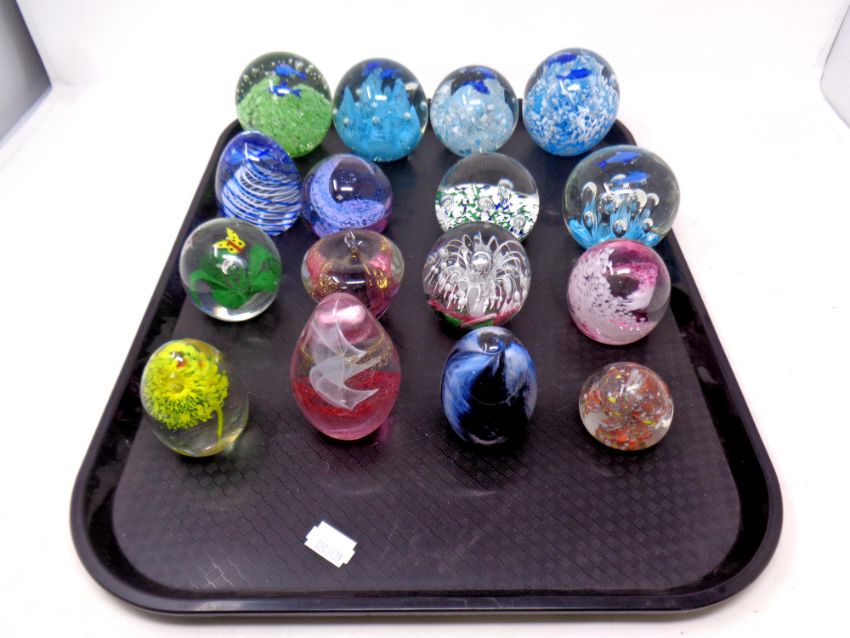 A tray containing sixteen assorted glass paperweights