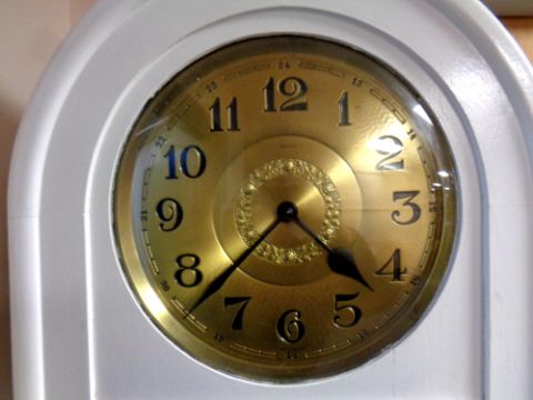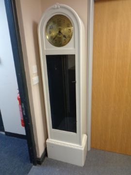 A painted oak cased regulator clock with circular brass dial, no weights and no pendulum