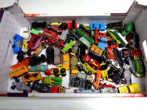 A box of play-worn die-cast cars, matchbox, Dinky etc