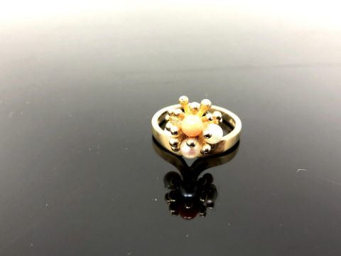 A 9ct yellow gold ring set with coral and pearl, size K, 3.4g.