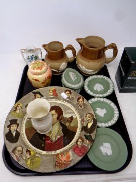 A tray of assorted ceramics, two antique pottery jugs, Wedgwood Jasperware, Royal Doulton plate, boxed Belleek vase etc