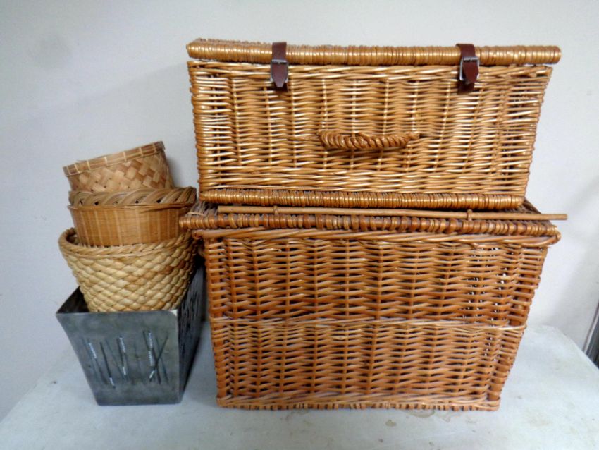 Two wicker picnic hampers together with four metal and wicker waste paper bins