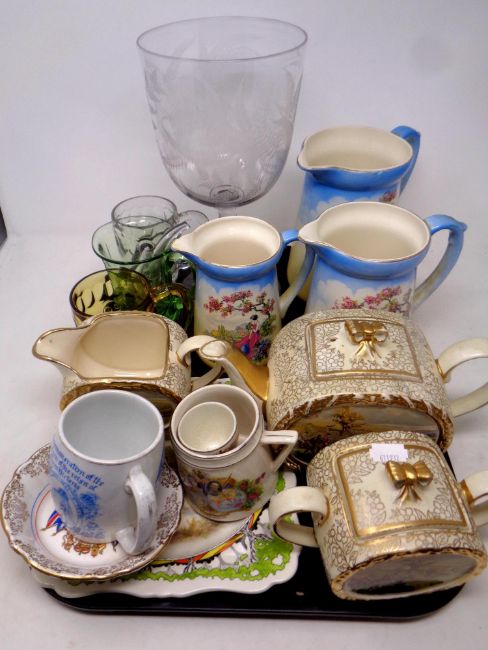 A tray of assorted ceramics and glass, three piece Sadler tea service, three Falcon ware jugs, etched glass oversized goblet etc