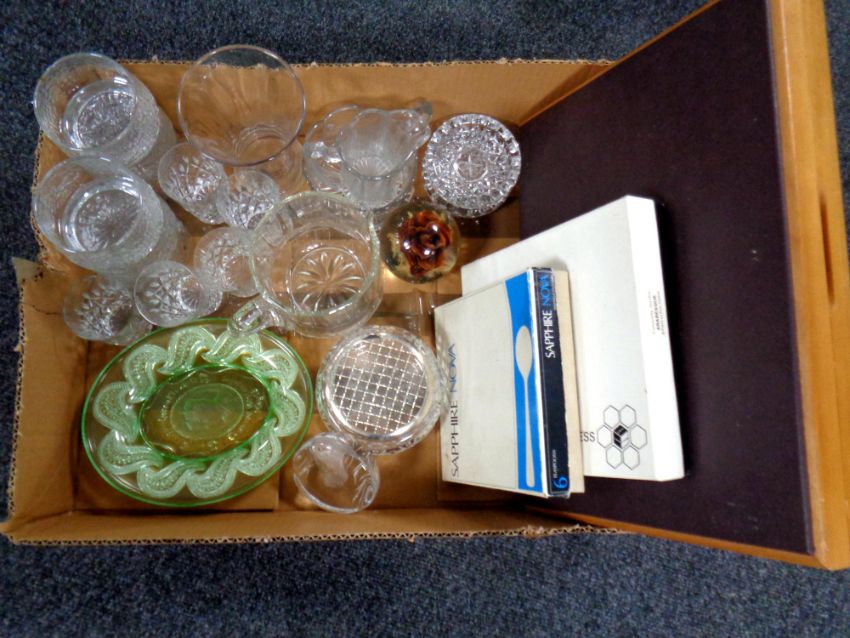 A box of glass ware, paperweights, coronation plates, canteen of Oneida flexfit cutlery, two boxed sets of cutlery
