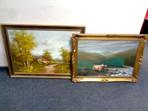 An oil on canvas - Highland cattle in rural landscape, signed Vince, together with a further oil on board 'Dwelling in rural landscape'