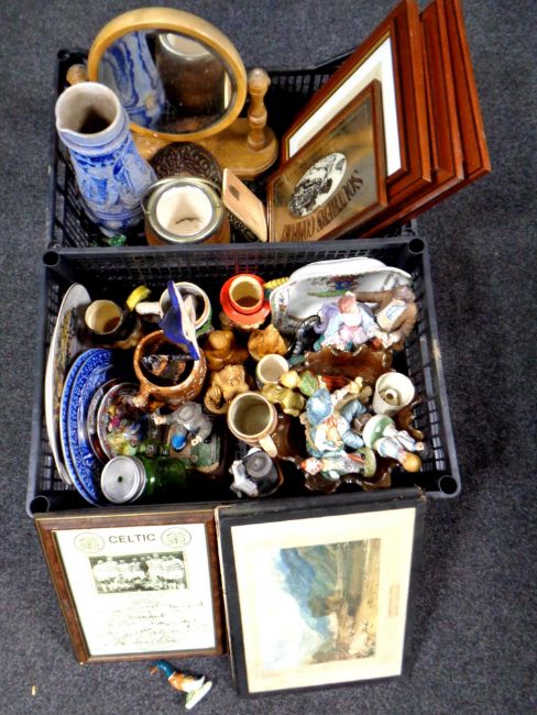Two crates of Southern Comfort mirror, framed pictures, ornaments, tankards, pine dressing table mirror