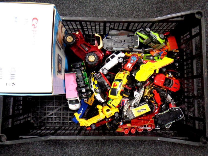 A crate containing die cast vehicles, plastic train, Cannon CP730 photo printer in box