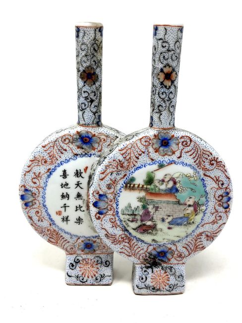 A Chinese double bottle vase, polychrome panels depicting figures and text, red four character marks to base, height 16.5 cm.