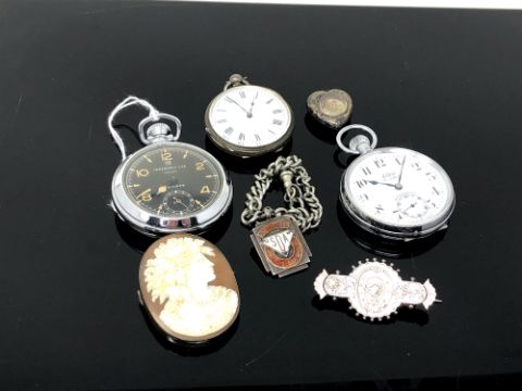 A Continental silver fob watch together with Ingersoll pocket watch, silver fob on chain, silver heart shaped compass locket, Cameo brooch etc