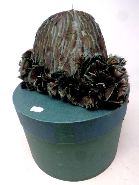 An Art Deco style feather hat in a Jenner's of Edinburgh hat box