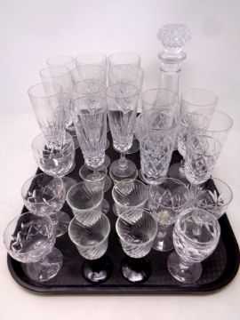 A tray containing assorted glassware to include wine and liqueur glasses, decanter with stopper