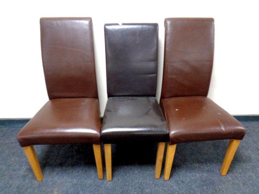 A sheesham wood extending dining table with leaf, length 225 cm, together with a set of five brown leather high backed chairs and one further leather dining chair