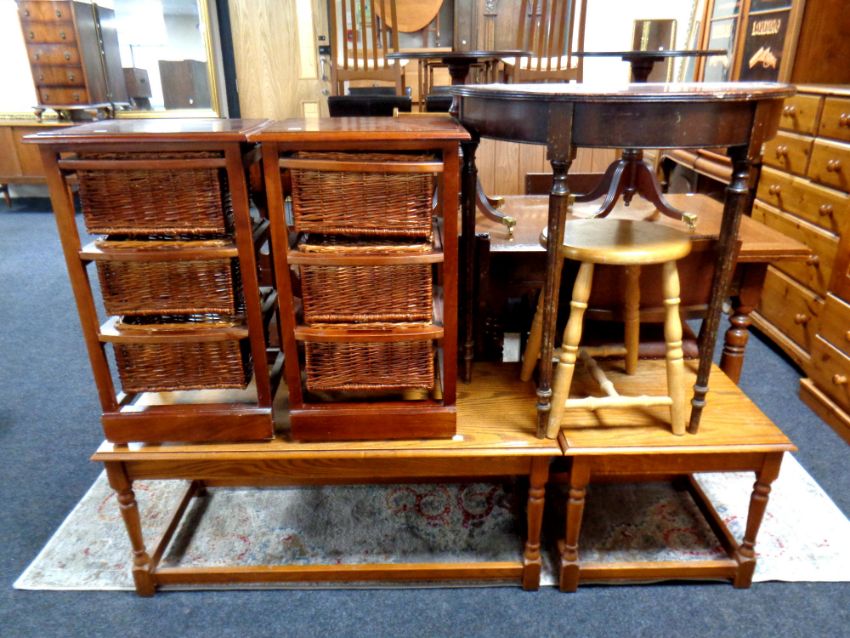 A pair of stained pine and wicker three drawer chests together with a D shaped hall table, a kitchen stool and a coffee table with matching lamp table