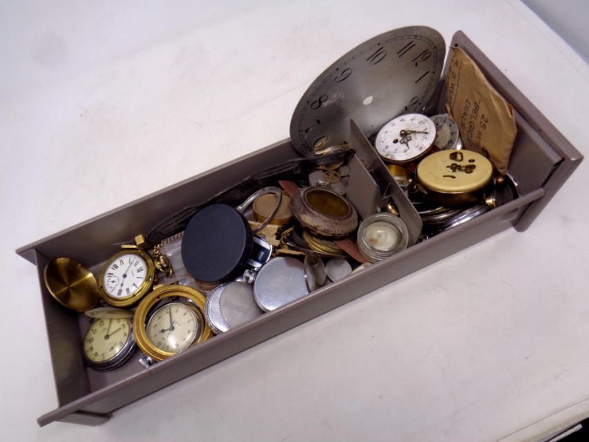 A large quantity of watch and clock parts, keys, pocket watch keys, glasses etc
