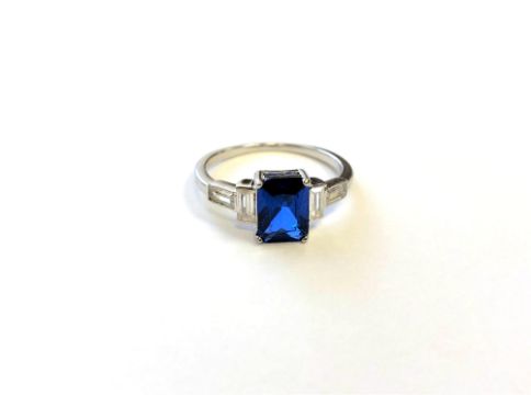 A sterling silver Art Deco style ring set with a blue stone, size N.