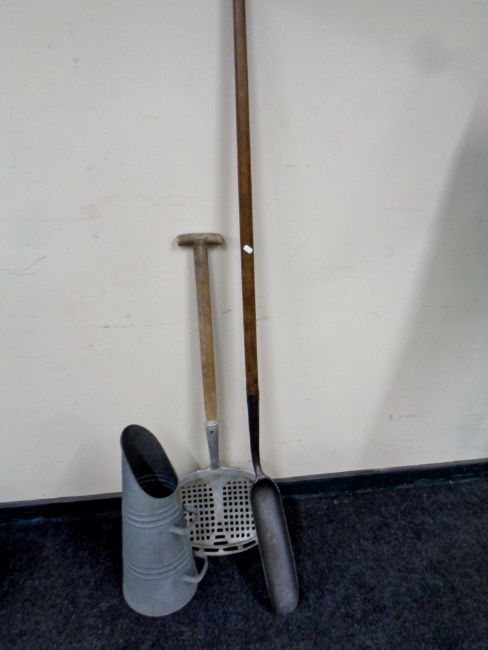 A galvanized coal scuttle together with a vintage long handled scoop and a shovel