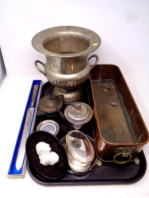 A tray containing assorted metal wares to include a copper and brass planter, plated wine cooler, bride cake knife in box etc