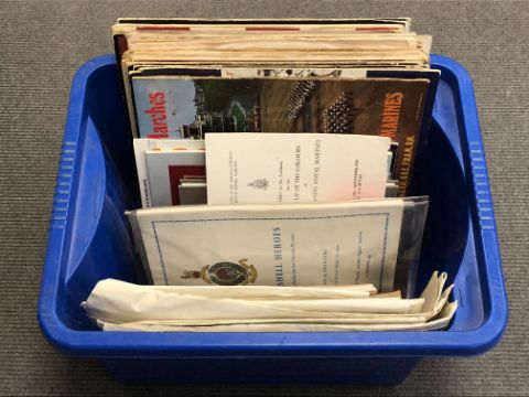A box containing military maps, military books, LP's including military band music, other music etc