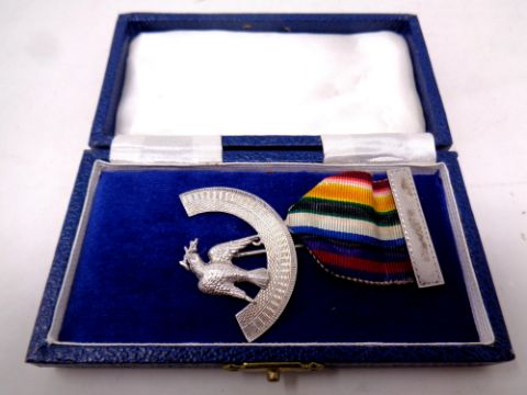 A silver masonic medal on ribbon in case
