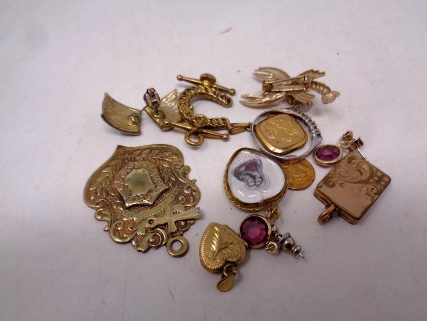A gold plated fob together with pendants, costume jewellery etc